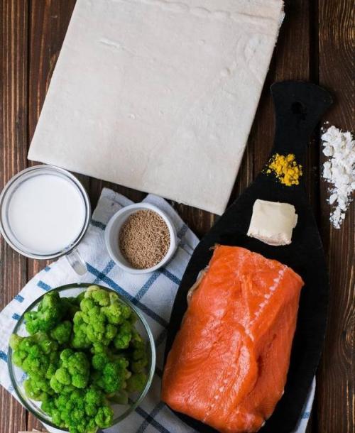 Ингредиенты: форель филе н\к (заморозка), молоко, хондаш, брокколи (заморозка), тесто слоёное (заморозка), масло слив., куркума, мука.Минут за 30 до начала приготовления достаньте из морозилки тесто.
